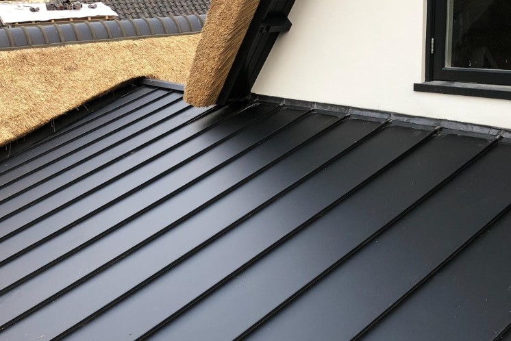 In Laren hebben wij een aluminium felsdak gemaakt onder een rieten kap.