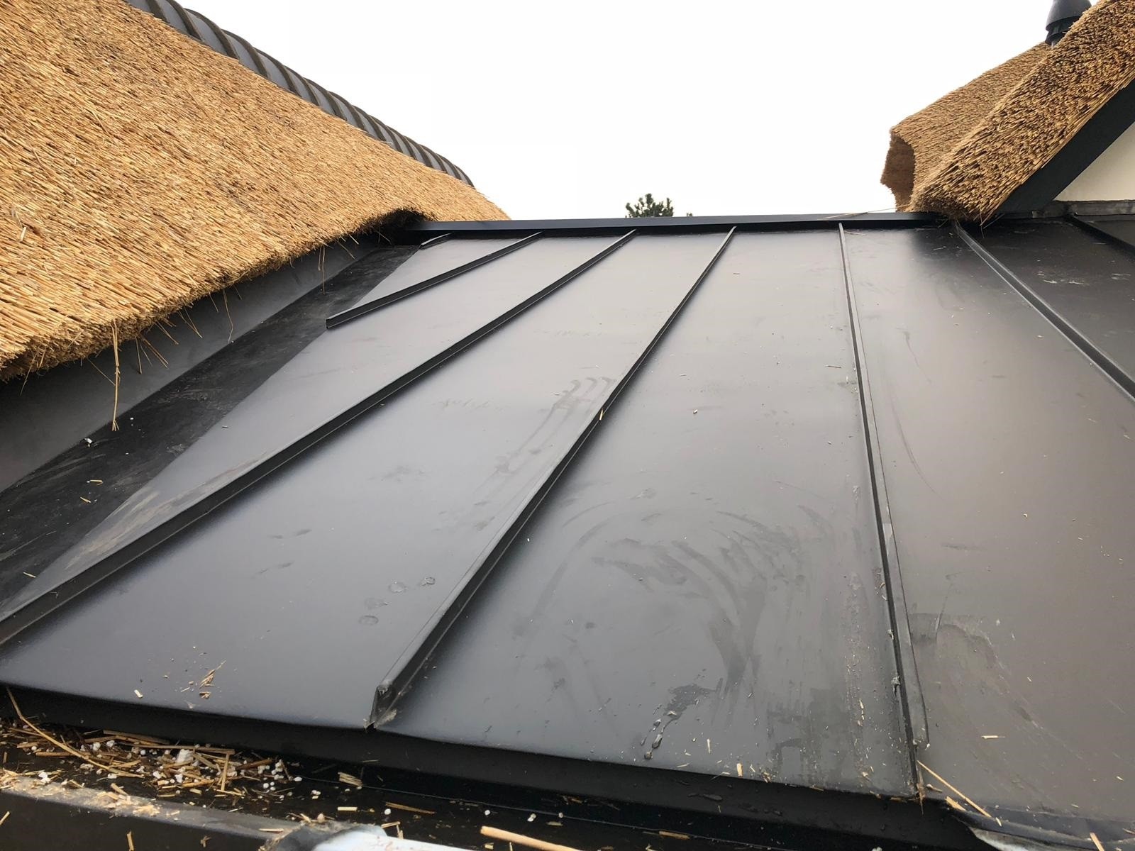 In Laren hebben wij een aluminium felsdak gemaakt onder een rieten kap. Aluminium is een uitermate geschikt product om te combineren met riet.